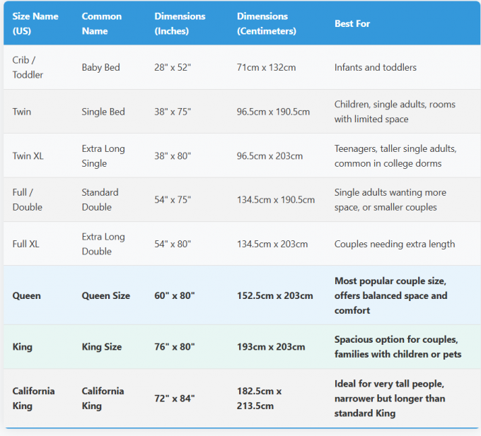 Todos os tamanhos de camas disponíveis, incluindo dimensões especiais